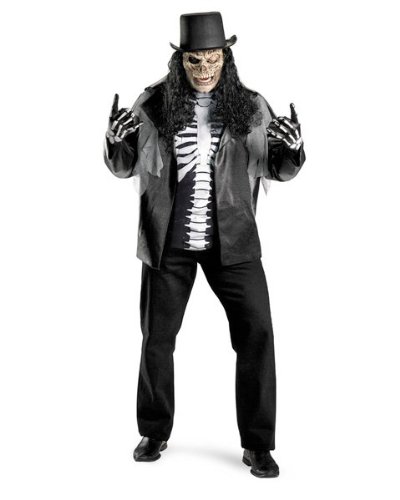 From the morgue to the stage, the Cryptic Rocker's undead corpse wants to rock! The Men's Plus Cryptic Rocker Costume features a black jacket with a printed skeleton shirt, a half mask of a zombie with rotting corpse-like flesh and a hat with attached long black hair. The pants, hands and makeup are not included. Applying zombie makeup is easy when you purchase one of our zombie makeup kits. * Includes jacket with faux printed shirt, half cap-mask and hat with hair * Pants, shoes and makeup for hands and face not included