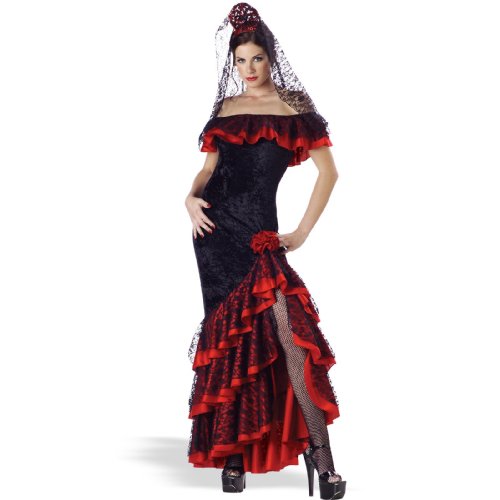 This sophisticated costume includes a black panne velvet gown with layered red satin and black lace ruffles, sequin headpiece with black lace mantilla veil and fishnet pantyhose. Shoes sold separately, may differ slightly from shown.