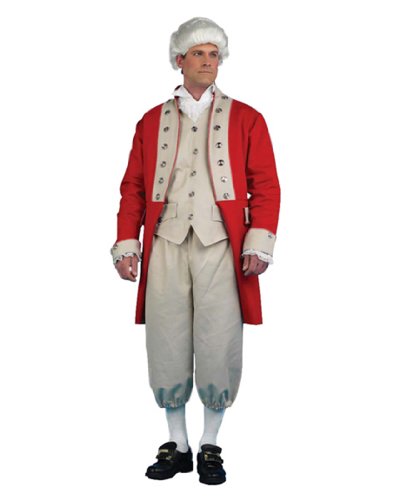 Includes Redcoat with tan accents, silver buttons, vest and pants. Available in Adult sizes Medium, Large, and X-Large. Wig differs from shown, shoe buckels, jabot and socks sold separately.