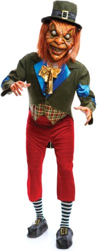 Find the gold at the end of the rainbow in this officially licensed leprechaun costume, this costume includes the jacket, mask with hat, vest, pants, socks, and shoe coverings, this costume is made from 70-percent polyester, 20-percent cotton, and 10-percent nylon, it is a size small but is also available in medium and large