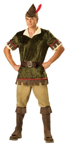 Adult Costumes - This Deluxe Robin Hood Costume includes the dark green crushed panné tunic with a creme colored collar, red piping and brown crenelated trim at the arms and hem, brown forester's hat, brown buckled belt and the leather-look boot covers. Trousers not included. Great as a couples costume with your date dressed up as Maid Marion!