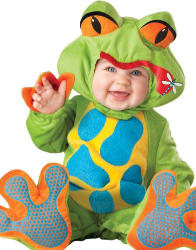 Little Froggy Costume includes a lime green lined zippered jumpsuit with a yellow tummy with blue spots and character hood with graphic tongue catching a dragon fly and big orange frog eyes. The Little Froggy Costume features slip-on booties with orange and blue skid-resistant soles that are meant for indoor usage only. This Frog Costume also includes snap leg closures for easy diaper change. This Infant/Toddler Costume is available in Infant sizes (6-12 Months) for babies 12.5 to 19.5 lbs, (12-18 Months) for babies 19.5 to 22 lbs and Toddler size (18 Months-2T) for toddlers 22 to 24.5 lbs. Made of Polyester. Care Instructions: Machine Wash.