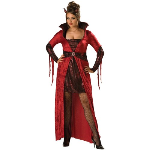 Devil Costumes - This Plus Size Deluxe Seductive Devil Costume includes the dress in deep red crushed panné and metallic reptile-skin lycra with a molded stand-up collar, long overskirt and attached short underskirt, attached belt and jeweled brooch, and the devil horns. Pair this up with any of our mens devils costume for a really sizzling couples costume look!