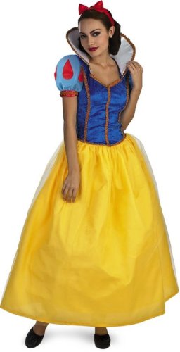 Snow White Costume includes dress with high collar, elegant trim and sheer overlay, and matching Headband with bow. This is an officially licensed Disney (tm) costume. This Story Book Adult Costume is available in One size Fits most adults up to size 14.