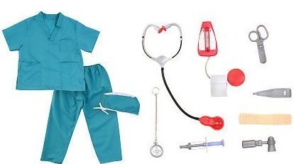 Is there a doctor in the house? You'll make any patient feel as good as new with the Imaginarium Surgeon Dress-Up Set. The realistic scrub uniform features a green top with three front pockets and touch closures on the side, a pair of elastic-waist pants and a cap. A stethoscope with light and sound helps you listen to every heartbeat, while a blood pressure pump allows you to make sure that each patient stays healthy. Also included are a plastic syringe, thermometer and reflex tool for your basic check-up needs, along with a cloth bandage to treat minor cuts and scrapes. Scrub in and start saving lives right in your own home! Fits most children ages 3-7. Three AG13 button-cell batteries included.