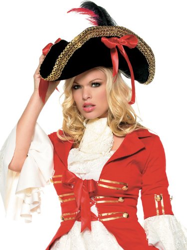 Deluxe pirate hat with heavy gold trim and side ribbons topped with ostrich feathers. One size fits most Adults.