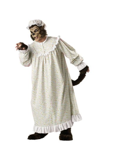 Little Red Riding Hood should have never strayed from the path - or she might have gotten to Granny's in time to stop the Big Bad Wolf from gobbling her up and taking her place! The Big Bad Wolf Adult Costume features a flannel granny nightgown with attached tail, furry plush shoe covers, plush fingerless gloves, a white night cap and a vinyl and plush chinless mask. If you interested in a couples look, consider attending your next Halloween party, adult themed costume party or just handing out candy with your mate in a Red Riding Hood Adult Costume (sold separately elsewhere on this site) Don't worry, she'll protect you from the woodsman, cause she really enjoys the company of wolves - or more particularly, the Big Bad Wolf that you are!