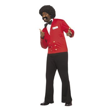 The Love Boat Isaac The Bartender Adult Men's Costume. Choose this fun polyester costume and be ready to trick-or-treat enter a costume contest or be the hit of the Halloween party! Wear this costume to a masquerade ball or as the perfect disguise at a haunted house. This outfit is sure to win you the best costume award at any Halloween costume party! Fits up to size 44.IncludesPolyester red jacketDickie with attached bowtiePantsWigMoustacheSpecial Shipping Information This item ships separately from other items in your order. Imported.