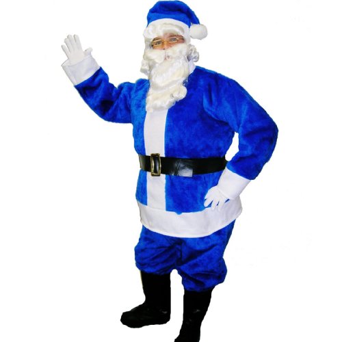 This Plush Blue Suit includes: Jacket, elastic waist pants, belt, black boot covers, wig and beard set, matching hat, and white knit gloves. Square Santa glasses not included.
