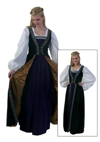 This women's Robe du Soir is an authentic piece of Renaissance wear! The two-piece costume includes a purple, polyester underdress that is floor length and sleeveless. A black trim with sliver accents lines the top hemline. The shoulder straps tie together with black string and the sides also lace up with black string. The black, velvet overdress is lined with gold on the interior and is trimmed with a colorful floral pattern on the outside. It also laces up over the torso with black string and gold loops. The bottom portion is open revealing the purple underdress. Complete this look with our white chemise.
